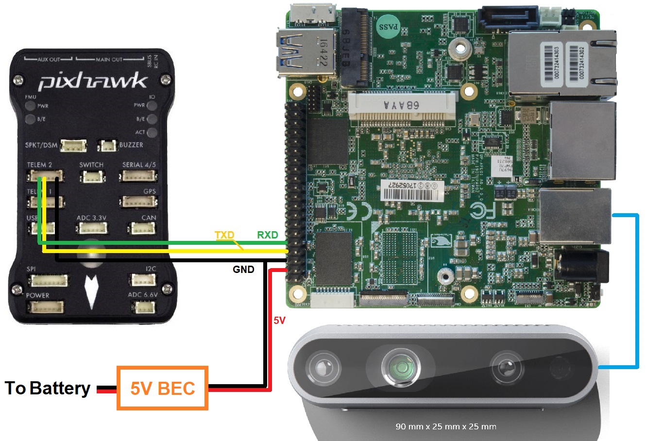 Intel RealSense D435i: พระเอกของงาน แนะนำรุ่น ‘i’ เพราะมี IMU ภายในช่วยเรื่องความนิ่ง และเป็น Global Shutter ทำให้ภาพไม่ย้วย (Jello Effect) เมื่อโดรนสั่นหรือบินด้วยความเร็ว