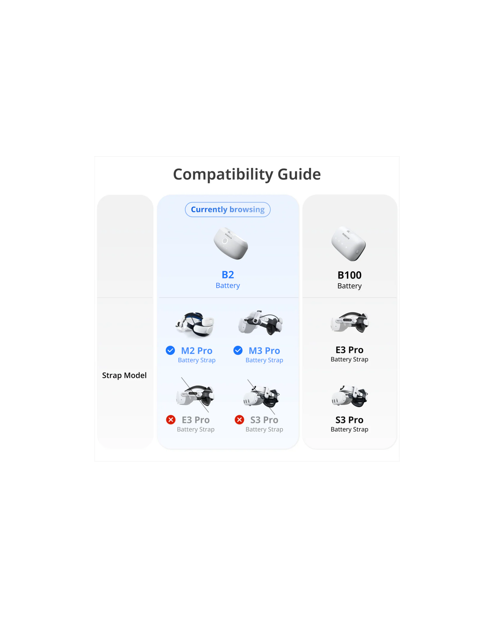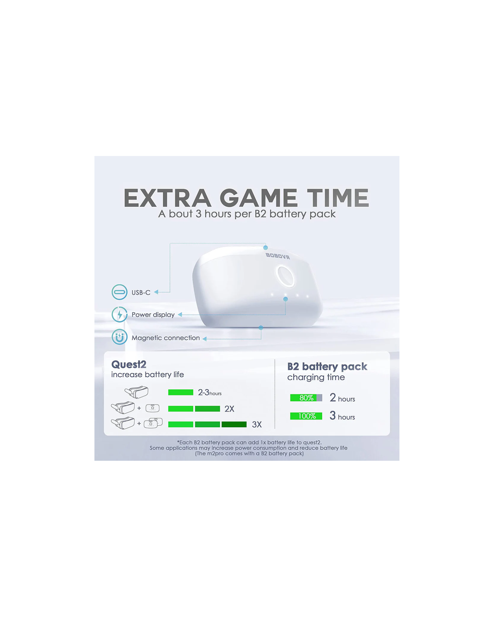 B2 คือชุดแบตเตอรี่แบบเปลี่ยนได้ ออกแบบมาโดยเฉพาะสำหรับสายรัดแบตเตอรี่ BOBOVR ชุดแบตเตอรี่นี้สามารถถอดเปลี่ยนได้ทันทีโดยใช้แรงดึงดูดแม่เหล็ก